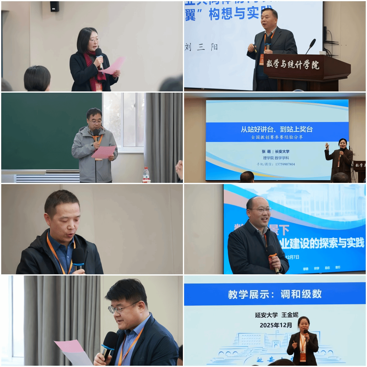 在随后的报告交流环节,与会专家和老师围绕数学专业建设、人才培养、教学创新、课堂教学等重要议题进行了热烈的交流和研讨。伟德betvlctor刘三阳教授和周红军教授分别作了题为《我省数学类专业共同体协同发展的“一体两翼”构想与实践》《数智背景下数学类专业建设的探索与实践》的精彩报告。长安大学张萌副教授以《从站好讲台,到站上奖台——全国教创赛参赛经验分享》为题分享了她获得全国教学创新大赛一等奖的成功经验并进行了12分钟国创赛的汇报示范,获得特等奖选手代表延安大学的王金妮讲师以《调和级数》为题,进行了教学示范。以上报告分别由西安交通大学易媛副院长、西北工业大学郭千桥副院长、西安电子科技大学高卫峰副院长、西北大学邵勇副院长主持。