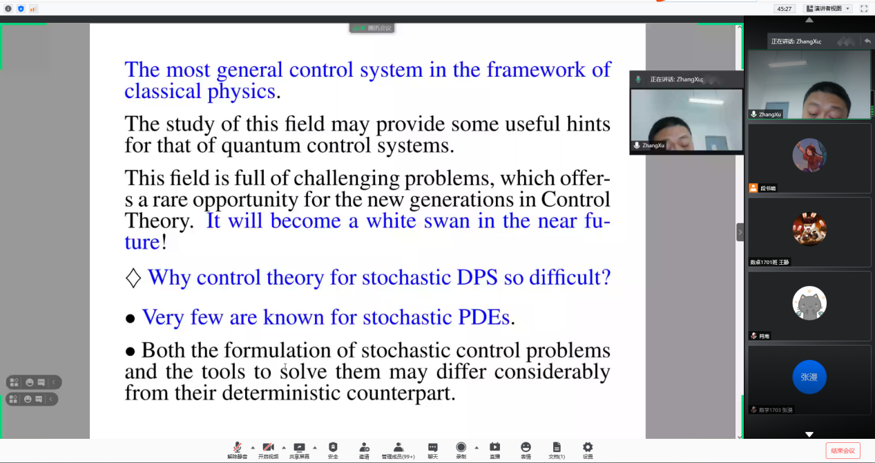 本报告从能控性和最优控制两方面,介绍了随机分布参数系统控制理论的发展历史脉络、该问题研究的难点、近年来相关问题的重要研究进展以及尚未解决的科学难题。同时张教授还指出了随机分布参数系统控制在量子控制等领域的潜在应用,为从事相关领域的研究人员提供了研究思路,并且鼓励有坚实数学基础的学生投身随机分布参数系统控制理论相关的研究,以期攻克该领域悬而未决的科学难题。张教授还同师生们进行了互动交流,详细解答了师生提出的相关问题,报告也在热烈讨论中落下了帷幕。