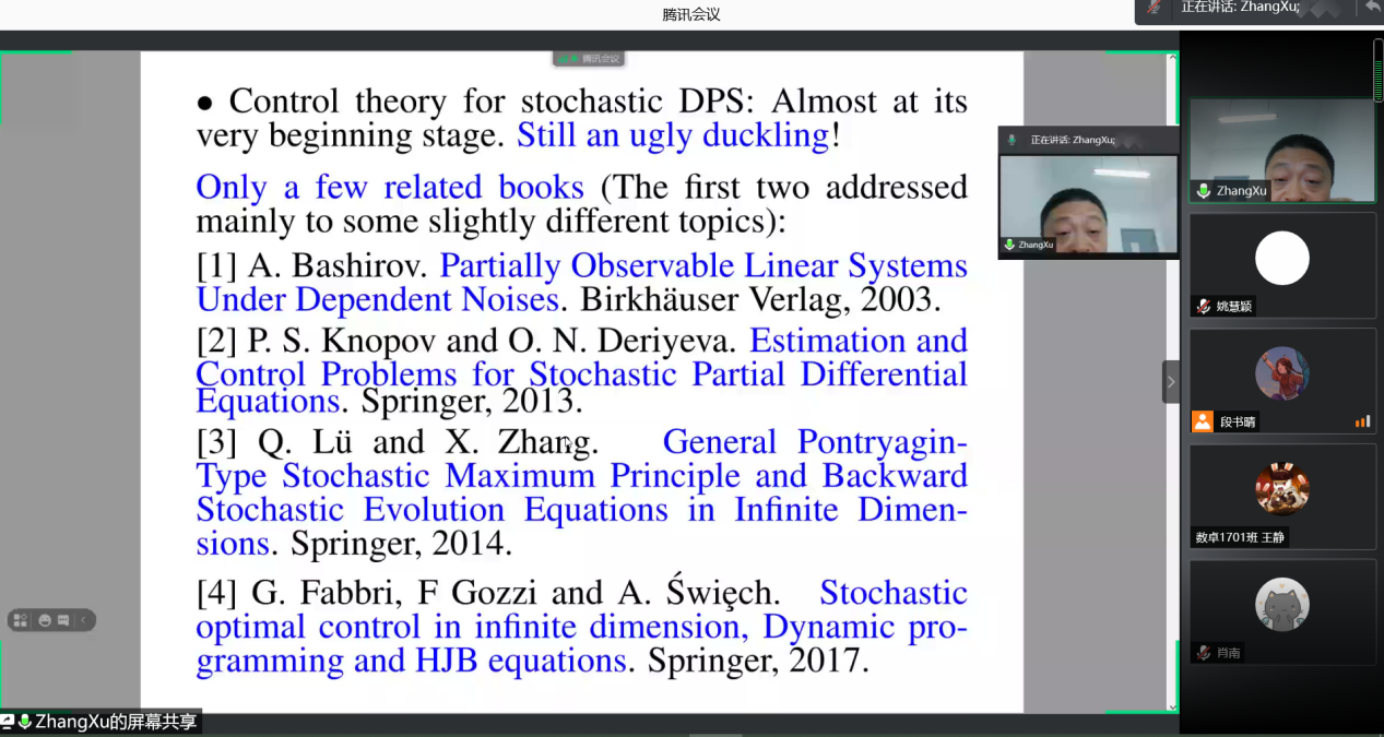5月12日下午,应学院邀请,国际数学家大会45分钟报告人四川大学张旭教授通过腾讯会议在线为伟德betvlctor师生作了题为《随机分布参数系统控制理论简介》的学术报告。报告由副院长赵志良教授主持,伟德betvlctor吴保卫教授、高兴宝教授、刘丽丽副教授、陈森讲师,西安交通大学、西北工业大学、西安电子科技大学等高校的同行学者和相关专业的研究生、高年级本科生等150余人聆听了本次报告。
