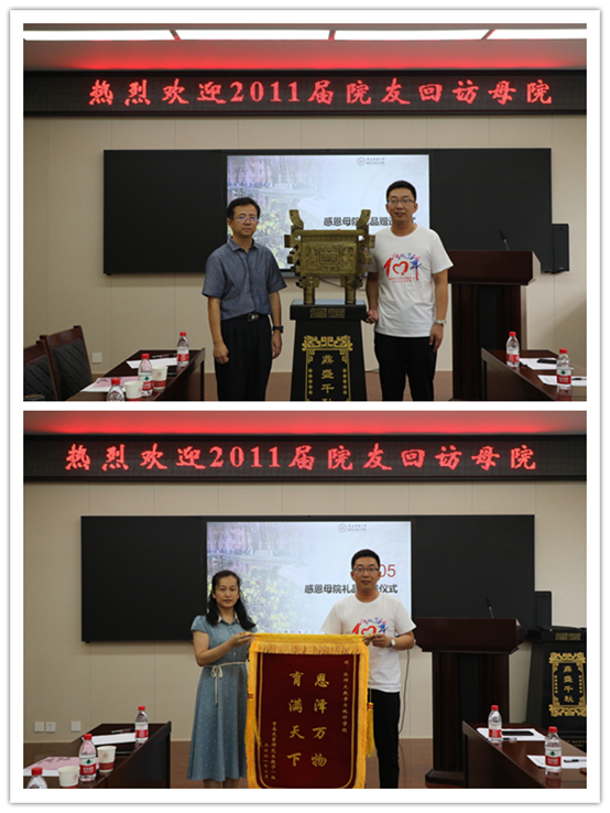 座谈会后,2011届数学一班院友向学院捐赠感恩母院礼品,并合影留念。